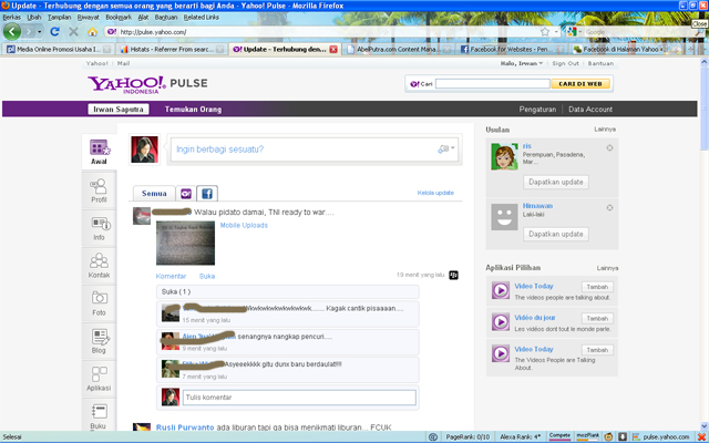 1. Jika Anda telah berhasil masuk ke Yahoo!Pulse dengan Akun Yahoo Anda (tentunya Facebook Anda sudah terhubung sebelumnya dengan Yahoo Mail Anda) seperti gambar dibawah ini