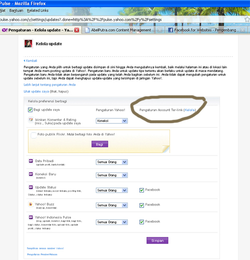 3. Kemudian akan muncul layar pengaturan seperti dibawah ini. Silahkan Atur sesuai dengan keperluan Anda. Anda dapat menghilangkan status update Facebook Anda di Yahoo ini dll.