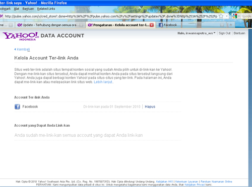 4. Jika Anda ingin menghapus berita, status Update Facebook di Yahoo Anda, Kik Pengaturan Account Ter-link (Kelola), dan akan muncul seperti layar berikut dibawah ini. Lalu Pilih Hapus pada pilihan Facebook.