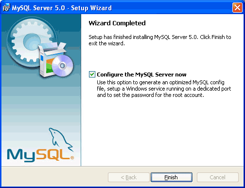 Tandai Configure the mysql Server now, lalu Klik Finish